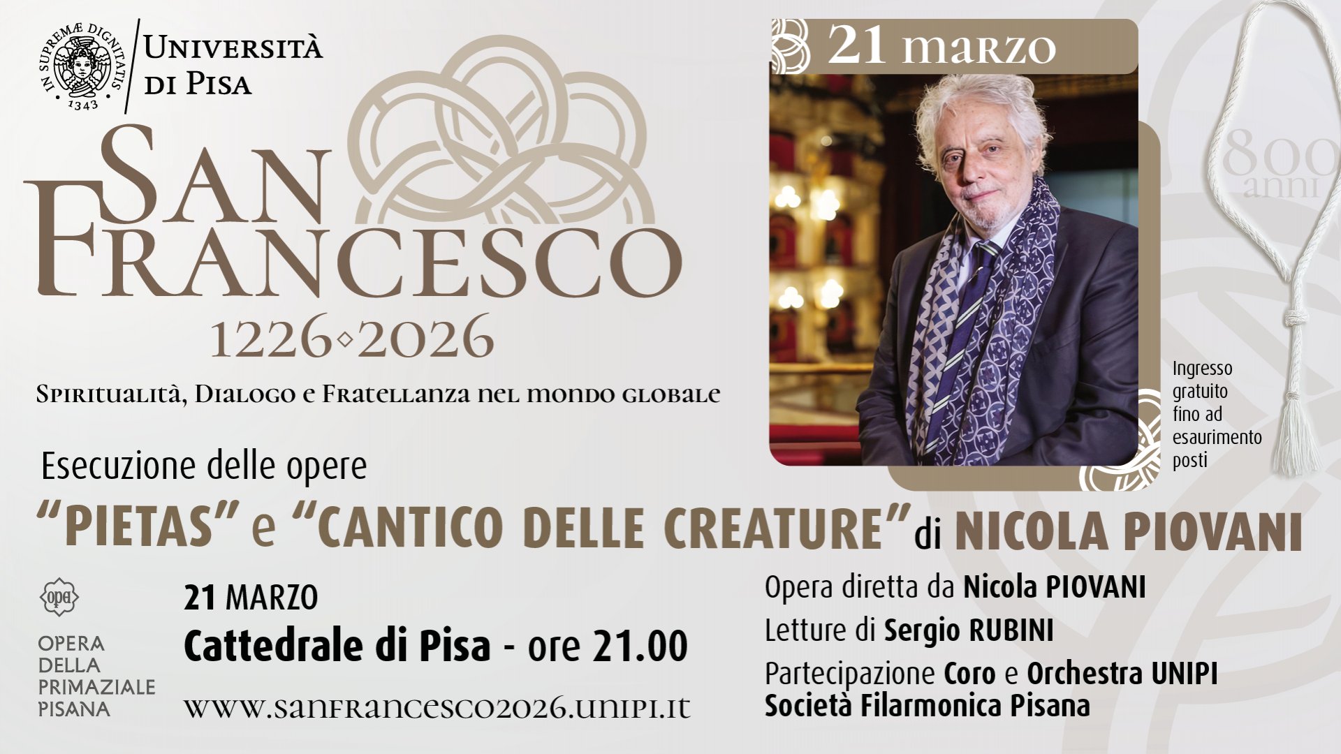 I posti sono tutti numerati. Il concerto inizia alle ore 21:00. La Cattedrale apre al pubblico alle ore 20:15 circa e l’accesso è consentito fino a 15 minuti prima dell’inizio del concerto. La Cattedrale ha due ingressi dalle porte in facciata, davanti al Battistero.